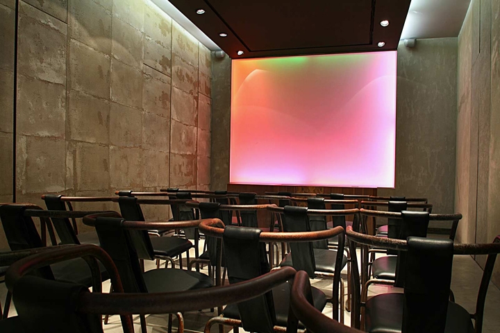 La sala meeting è situata al piano terra di un hotel moderno e di design situato vicino al Duomo. La sala è arredata con tavoli di legno riciclato e sedie appositamente create su disegno di Vincenzo De Cotiis. La parete di fondo è illuminata da una megaschermo di luce colorata che crea un forte effetto scenico.