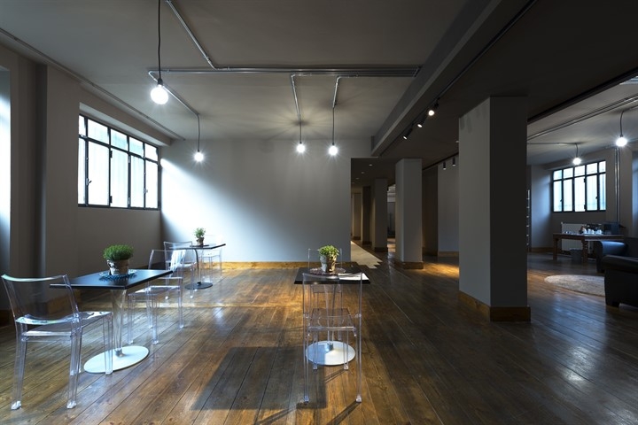 Si sviluppa su un unico piano di 450 mq e strutturato su più zone: un'area di ingresso, una cucina a vista con 6 postazioni, una ampia sala e una seconda cucina a vista.