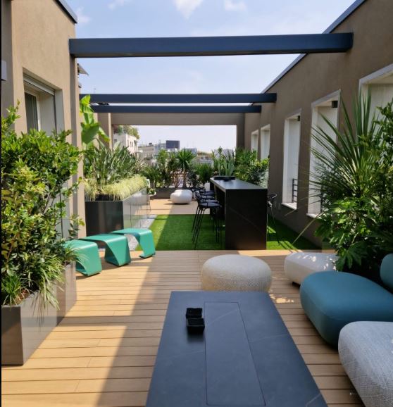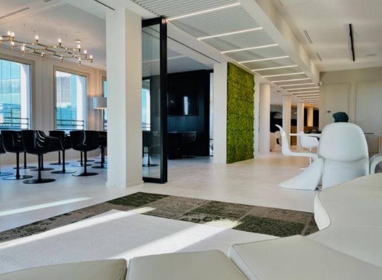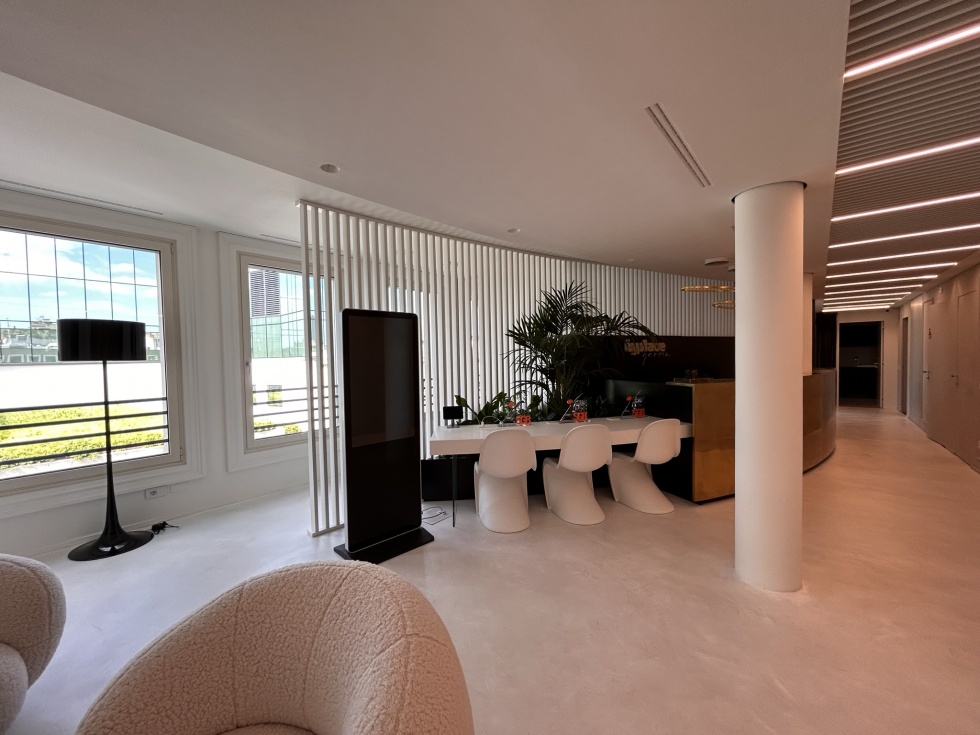 Dotata di ogni comfort e attrezzatura: cucina utilizzabile, bagni rinnovati, meeting room con schermi da 75" e 65", totem personalizzabili e una terrazza arredata con tavoli, poltrone e diverse tipologie di piante.